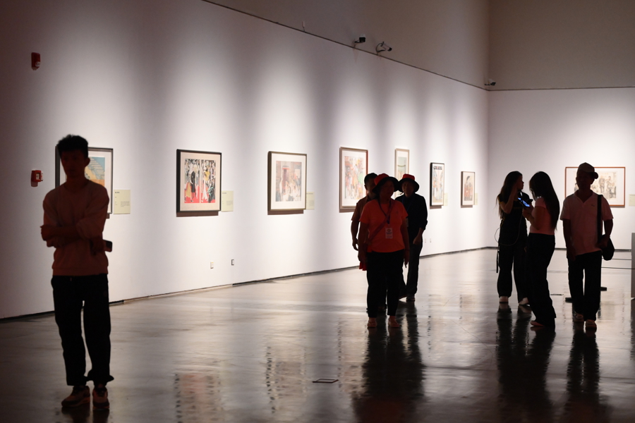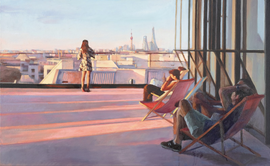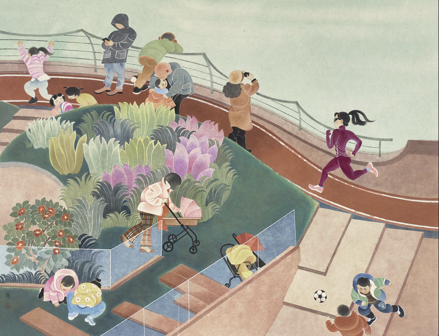 近年来,上海认真践行人民城市理念,推动打响“上海文化”品牌,更好满足人民群众精神文化需求。因此,“人民”板块着眼于市民的获得感、幸福感与安全感,勾勒出一幅幅都市品质生活的生动图景。版画《魔都色彩》刻画了正在观展的市民,画面中黑白倒影与观众充满活力的服装色彩相映成趣,映照出上海繁荣的艺术生态;油画《黄昏漫步:上海的霞晖》以温暖的光影捕捉动人晚霞,让青年们与城市地标共沐余晖。