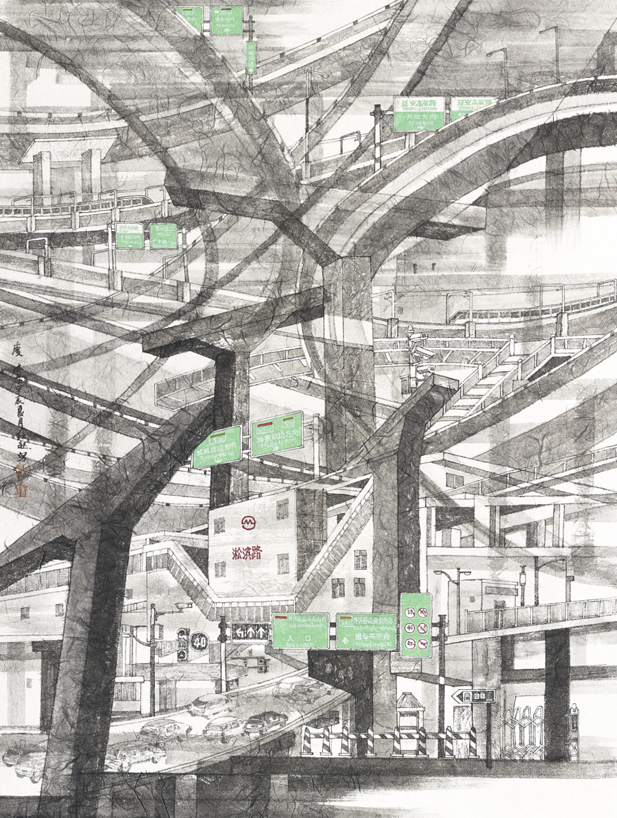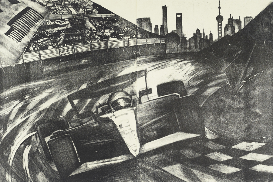 石版画《飞驰上海,城市脉动》。上海美术馆供图。