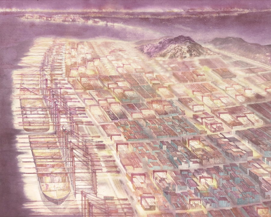 00后孙小清是本次展览年龄最小的参展者,其作品《潮涌东方》以俯视视角与罩色技法,展现出洋山港作为世界级集装箱港口的壮美图景。她表示,作为一名在上海成长的青年艺术家,愿以当代笔法持续描绘这座城市日新月异的面貌。