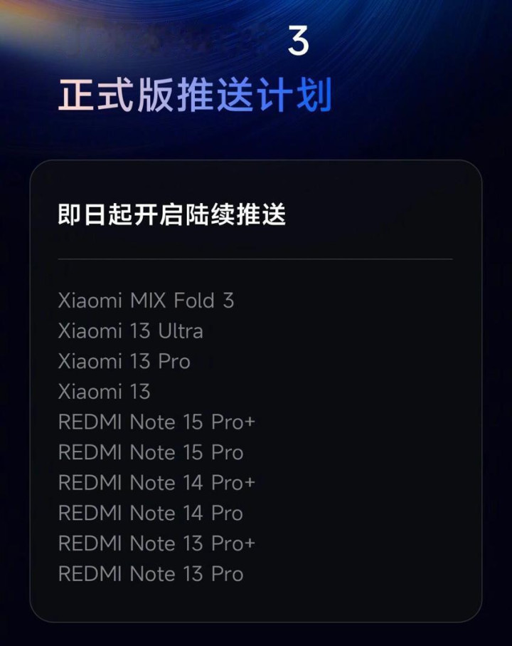 另外,今天官方更新了推送机型,覆盖了小米 13 系列、MIX Fold3 以及不少 REDMI Note 机型,已经开始灰度推送。