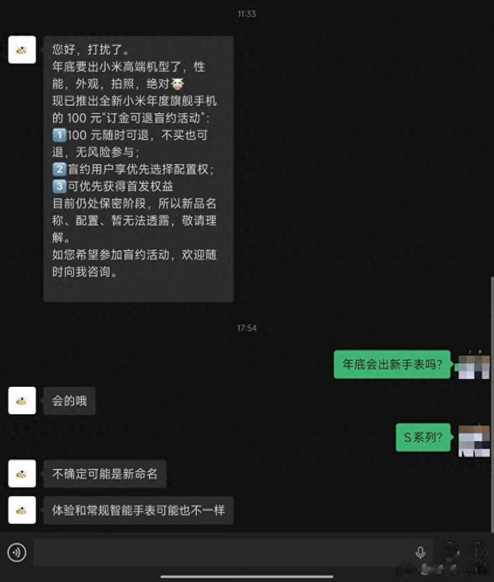 如今,有线下门店似乎已经开启了这款新机的盲订活动,有网友在网上晒出了聊天记录,100元就可以参与活动。